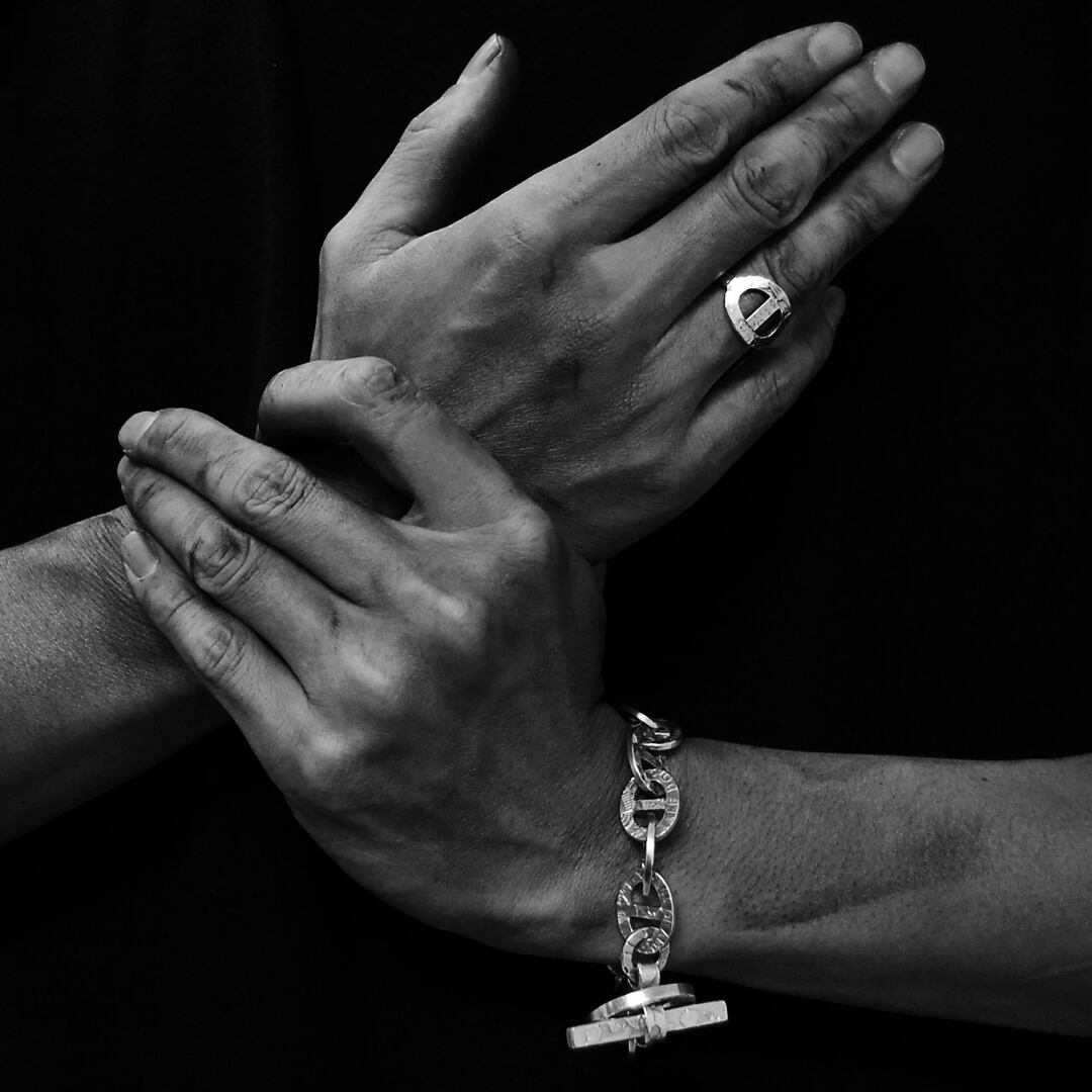船のアンカーチェーン(スタッドチェーン)から着想を得て、貴重な1964年のアメリカのハーフダラー銀貨(50セント)を贅沢に用い製作された“Stud Chain Bracelet"。