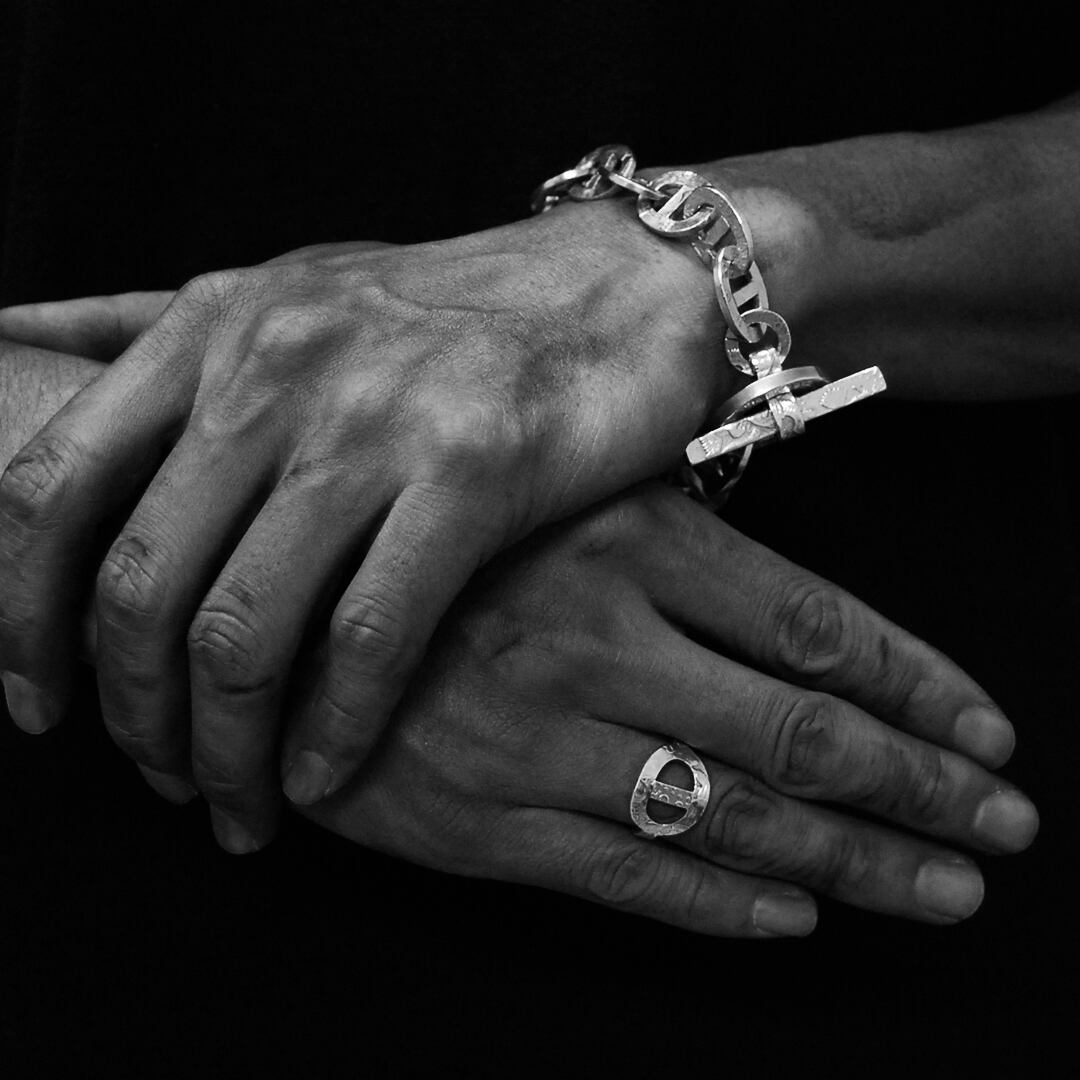 船のアンカーチェーン(スタッドチェーン)から着想を得て、貴重な1964年のアメリカのハーフダラー銀貨(50セント)を手作業でカッディング、研磨、湾曲など、職人の高度な技術と繊細な作業で経て形成されたオールハンドメイドのリング “Stud Chain Ring"。です。