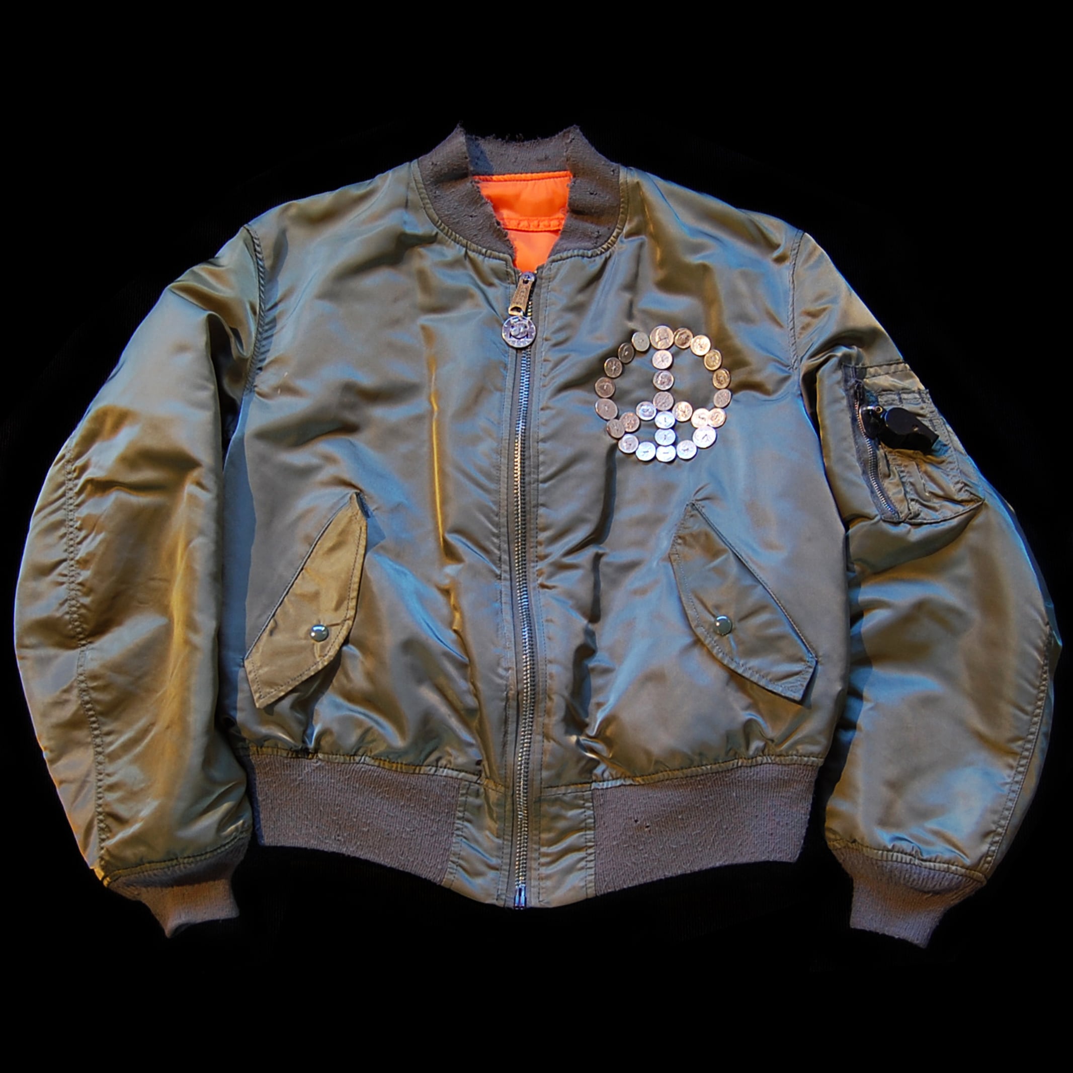 世界を平和にしてくれるのは、彼らかもしれないと思い、90年代頃のアメリカ製のMA-1にメッセージとピースマークを手作業で縫い付けた平和への願いを込めた特別なモデルです。