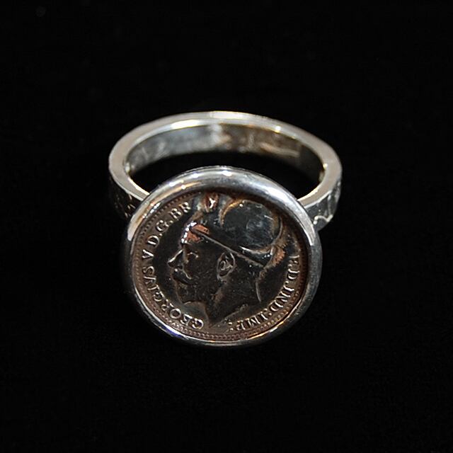 ビンテージコインに1点づつ手作業で新たなデザインを彫り加え完成したリング。